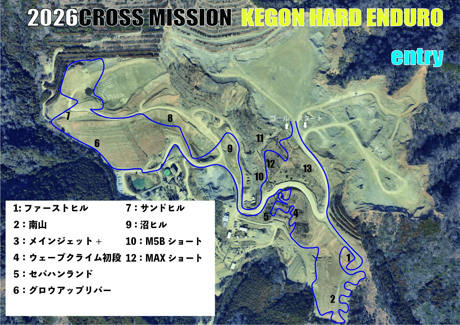 ・エントリークラス:ハードエンデューロ初級〜中級の方を対象としたクラス。X〜XXクラスを想定してレイアウト。周回できるように設定。