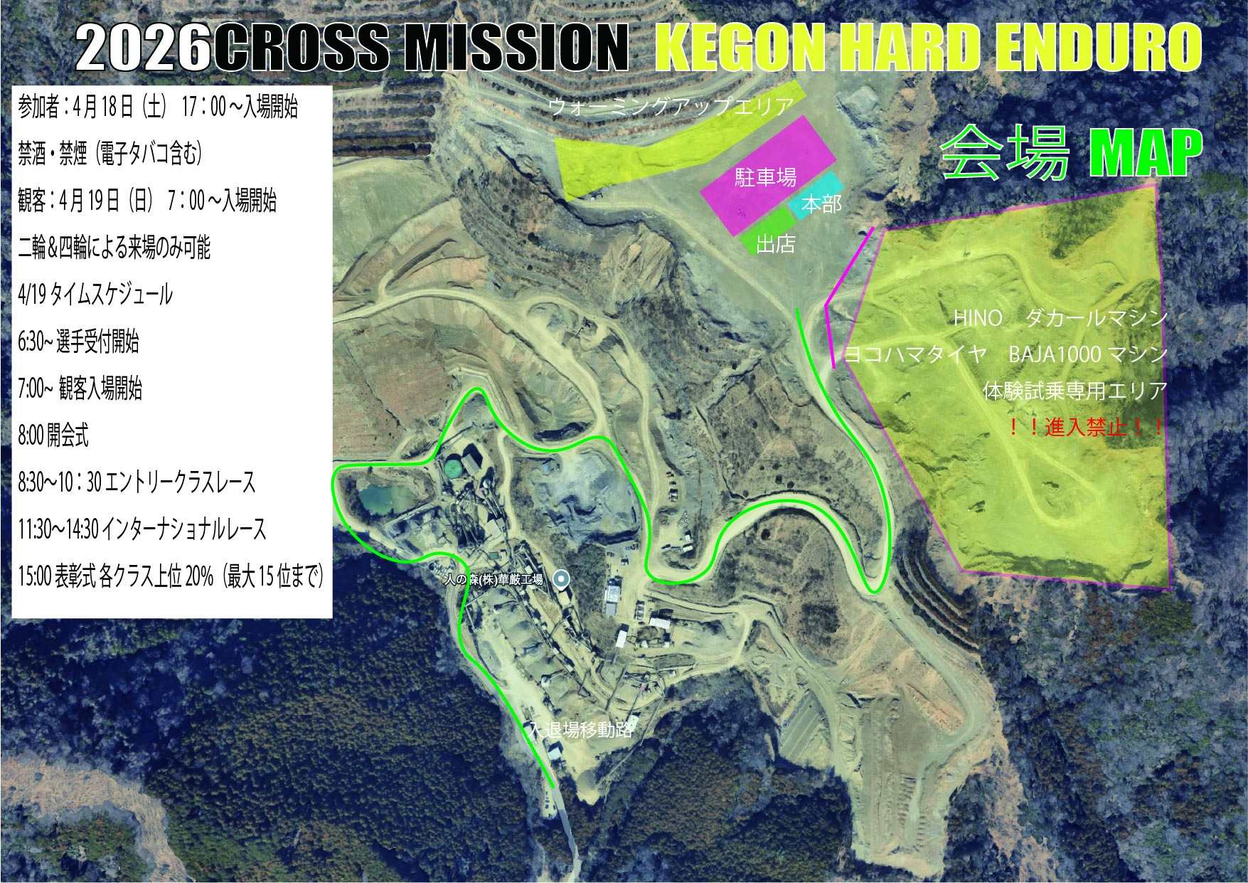 大会関係者:4月18日(土)の9:00~場内入場可能(出荷作業がある可能性があるため県道から場内までの通路は徐行と砕石関係車両優先