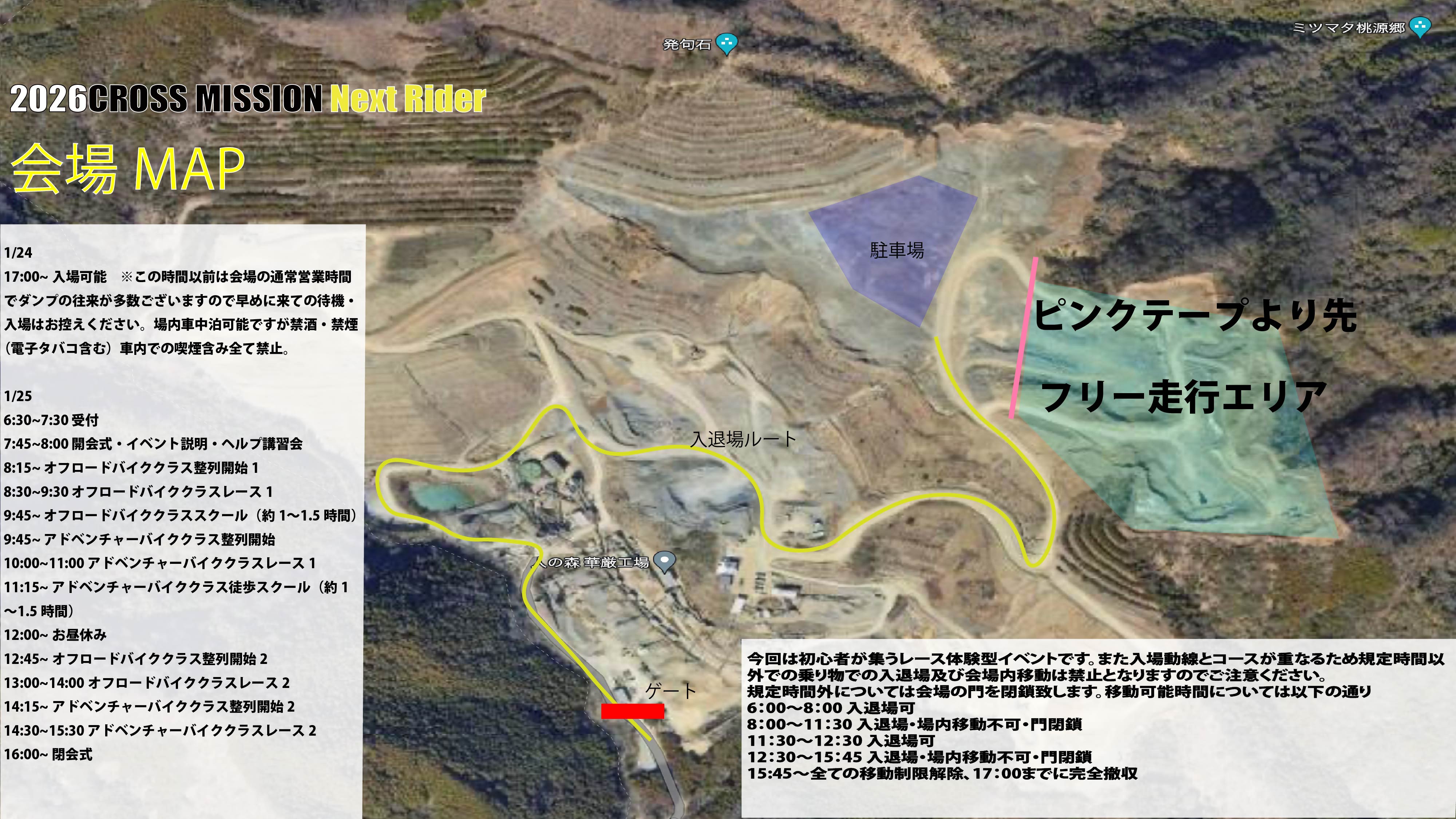 大会関係者:1月24日(土)の9:00のみ場内入場可能(出荷作業がある可能性があるため県道から場内までの通路は徐行と砕石関係車両優先。上記時間外での前日入場希望の方は別途ご連絡ください。